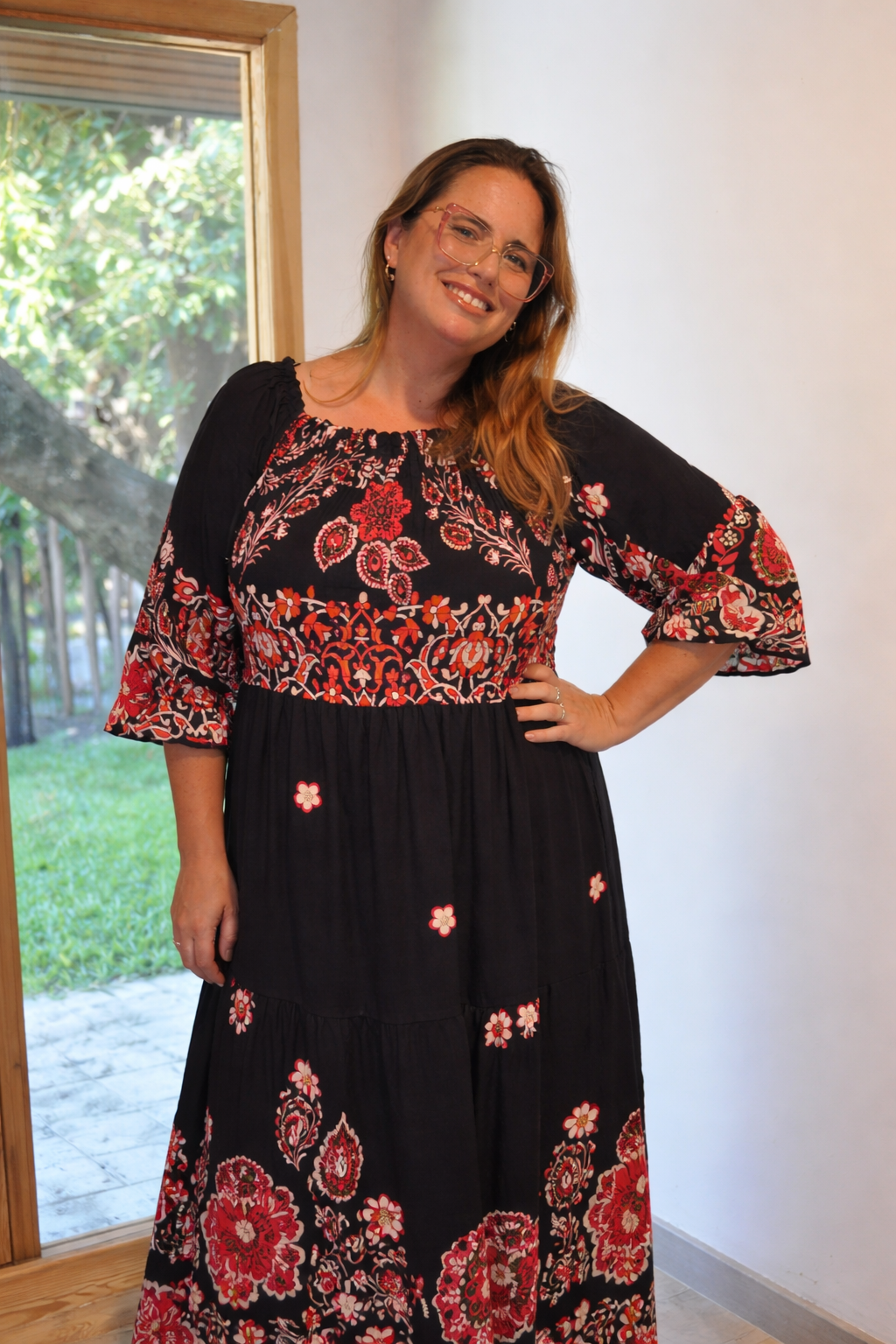 Su delicado estampado ornamental le aporta un toque elegante y femenino, mientras que las mangas 3/4 y su falda amplia dan movimiento y comodidad al caminar.