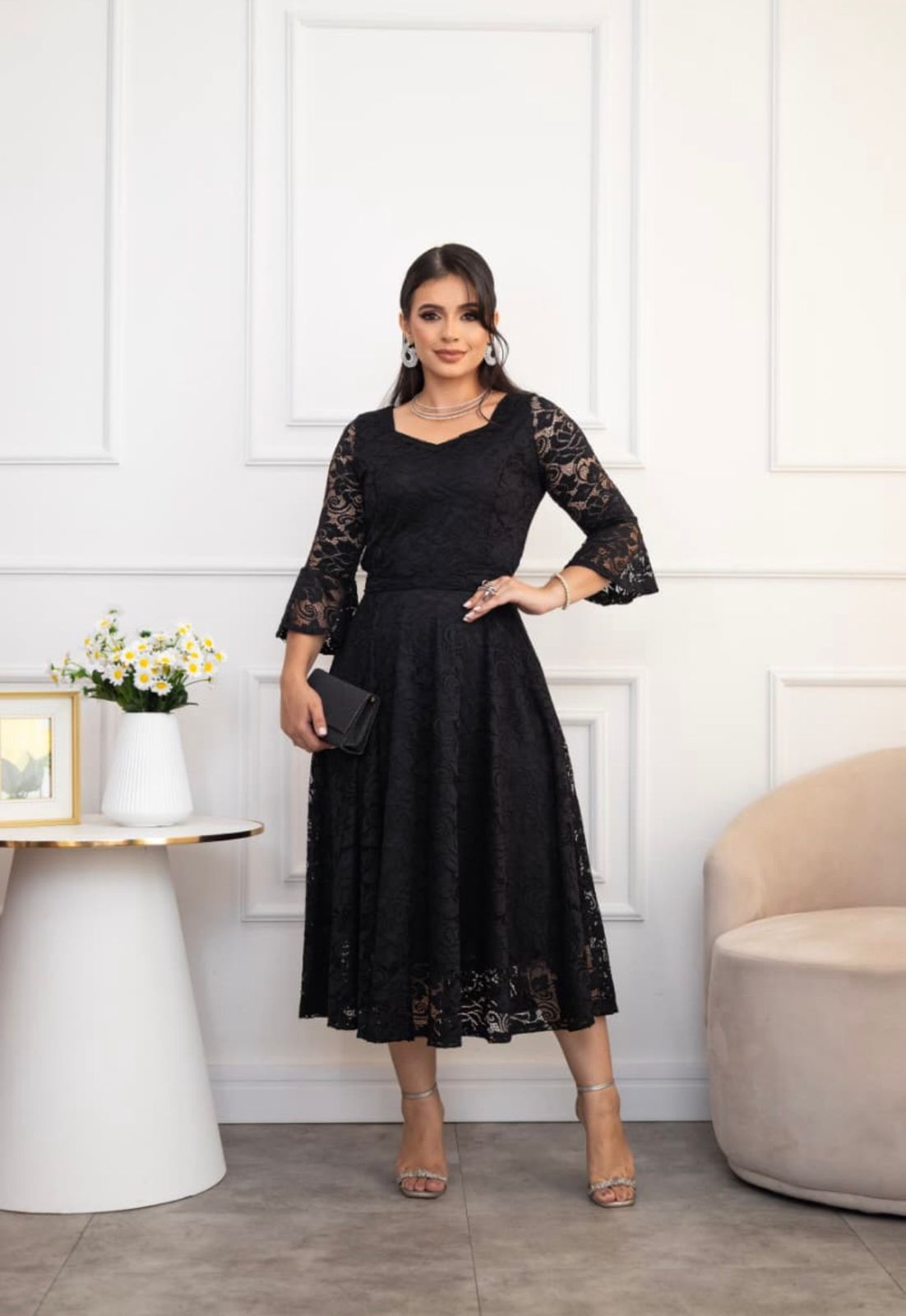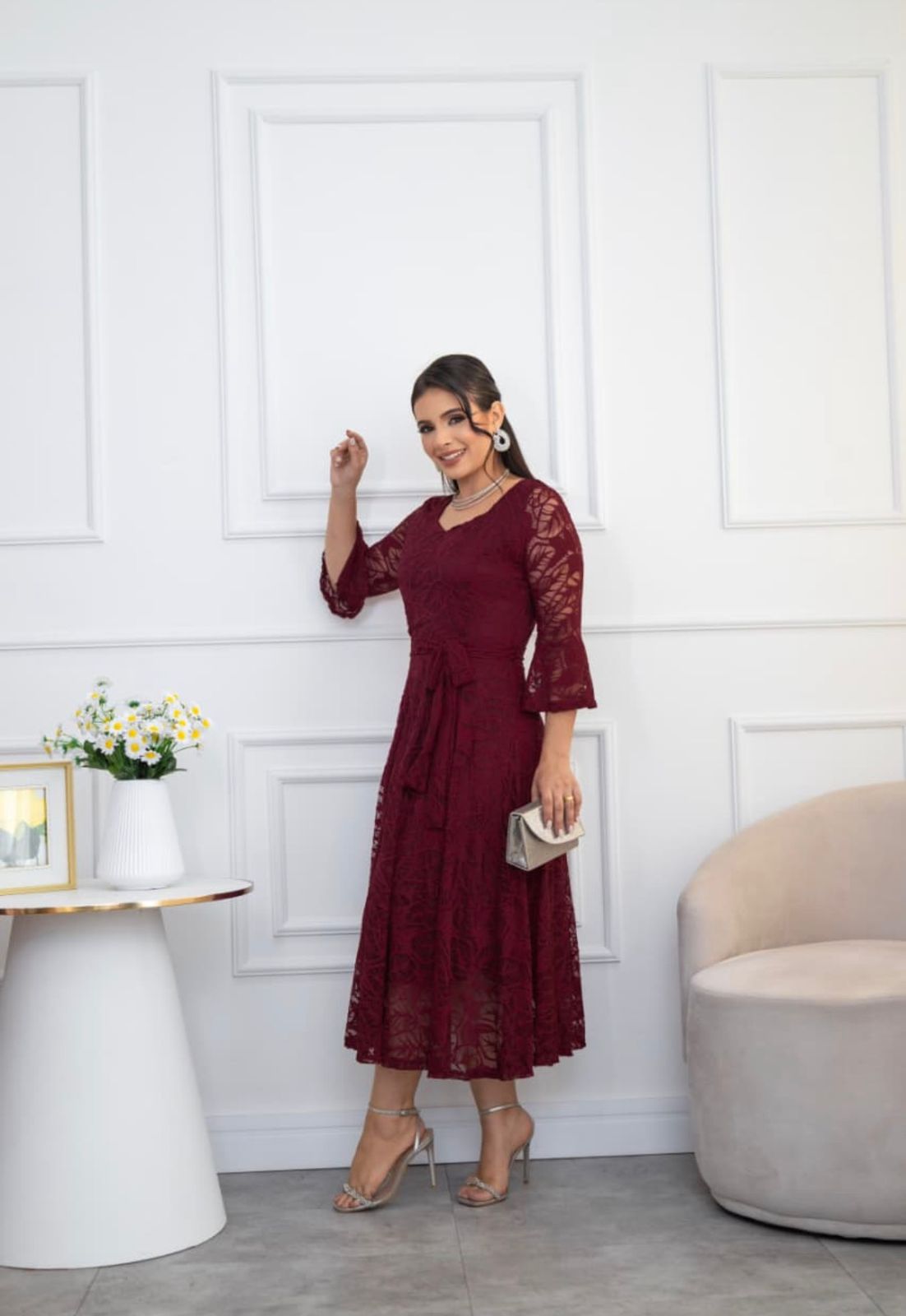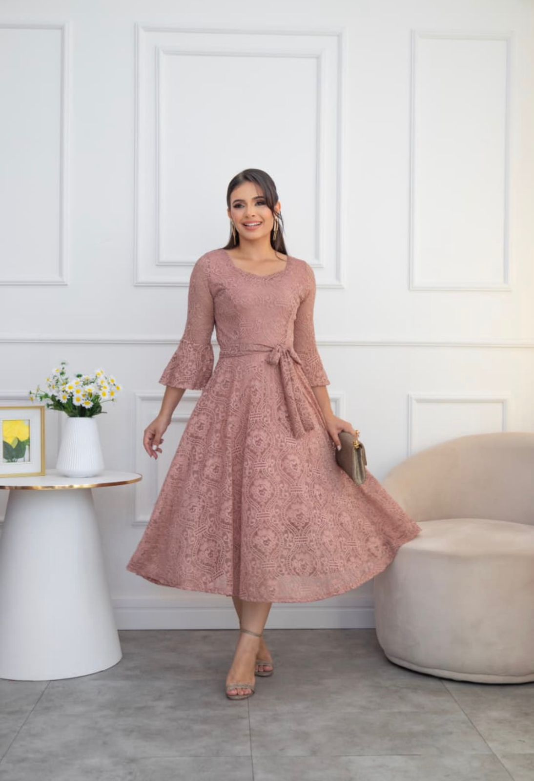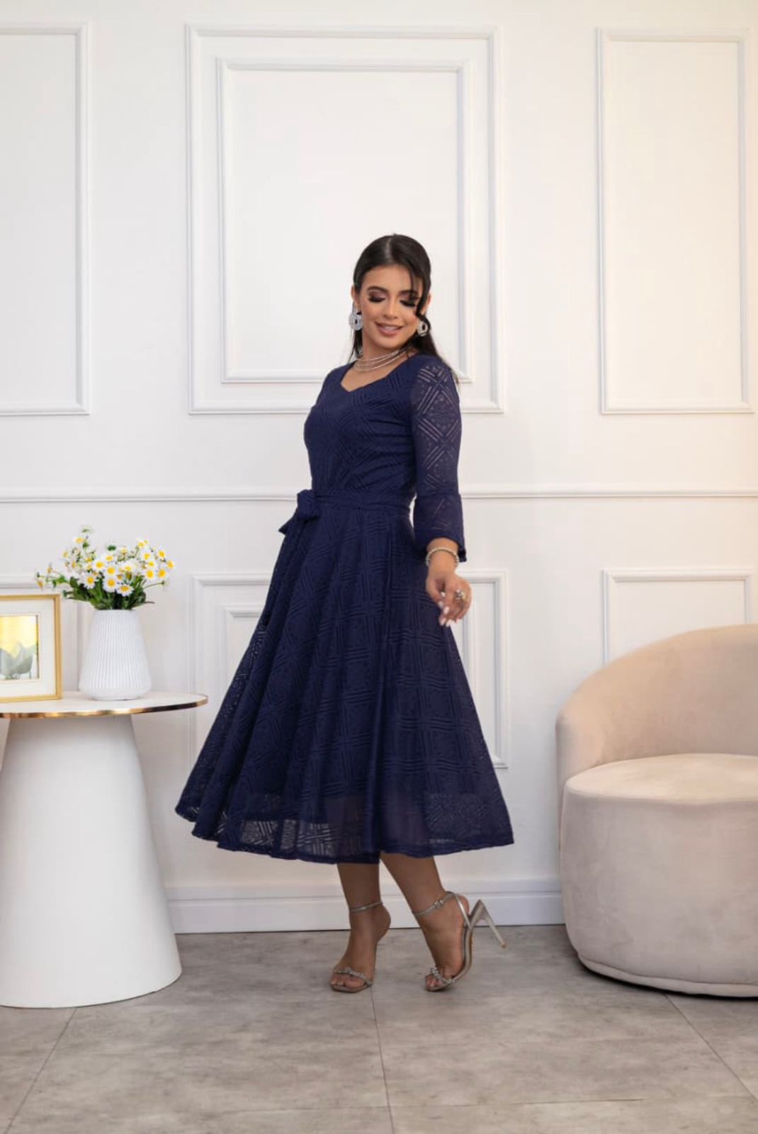 Su silueta midi con falda amplia genera un movimiento fluido y femenino, mientras que el lazo en la cintura permite ajustar y resaltar la figura con suavidad. Las mangas aportan un detalle distinguido que completa un look armonioso y refinado.