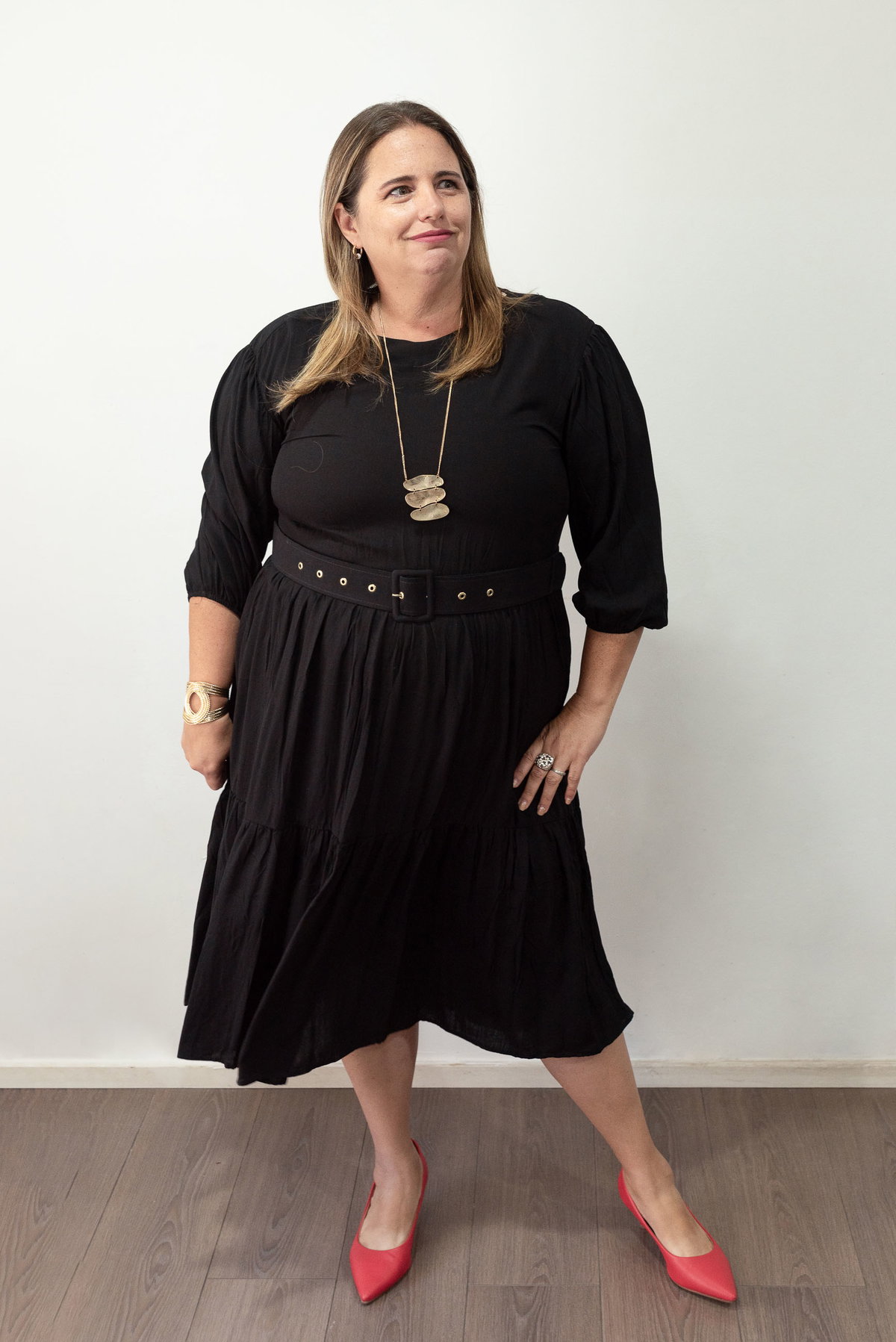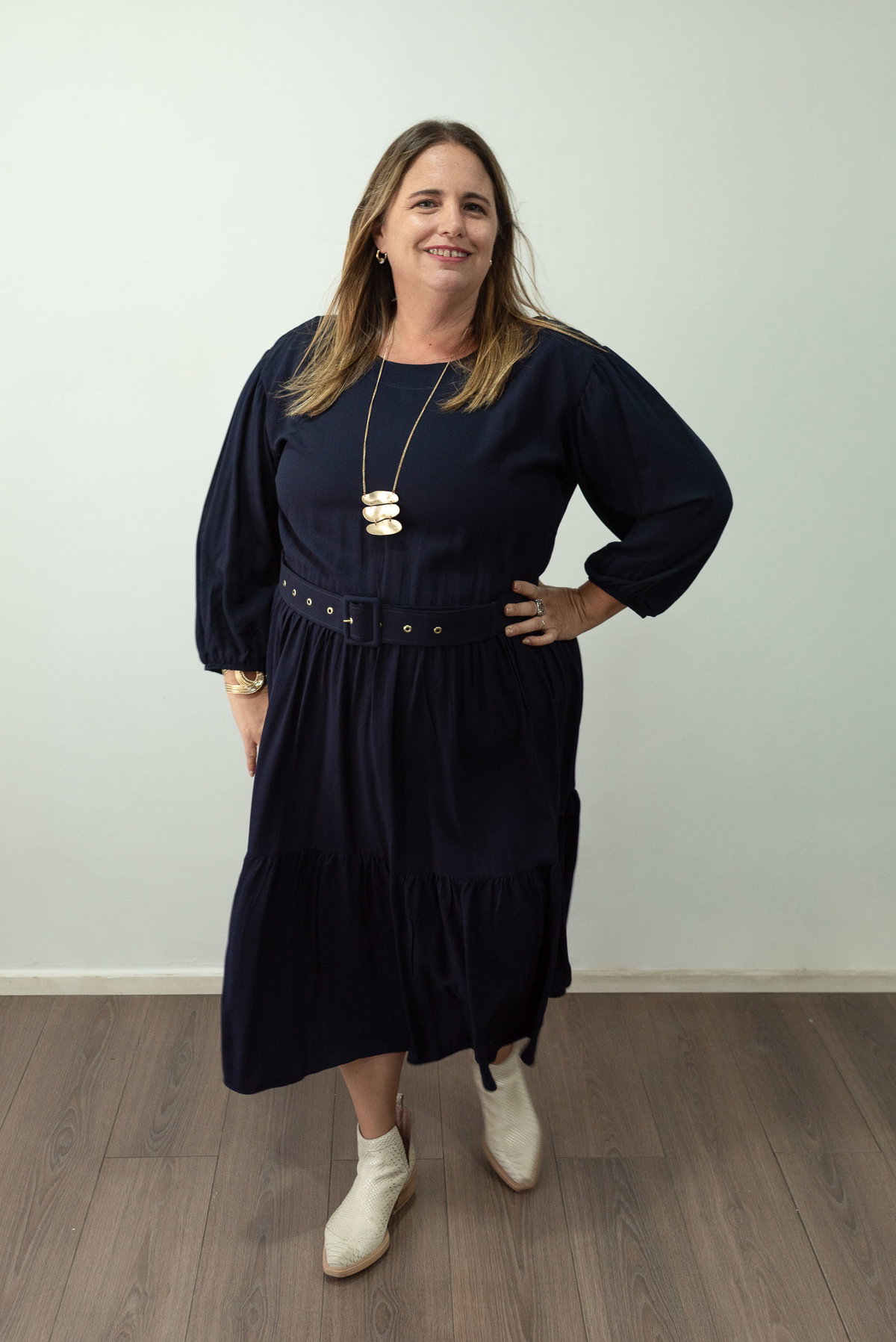 Disponible desde talle P hasta G2, es un vestido inclusivo, cómodo y fácil de adaptar a distintos estilos. Podés usarlo con el cinto para marcar la figura o sin él para un look más relajado.