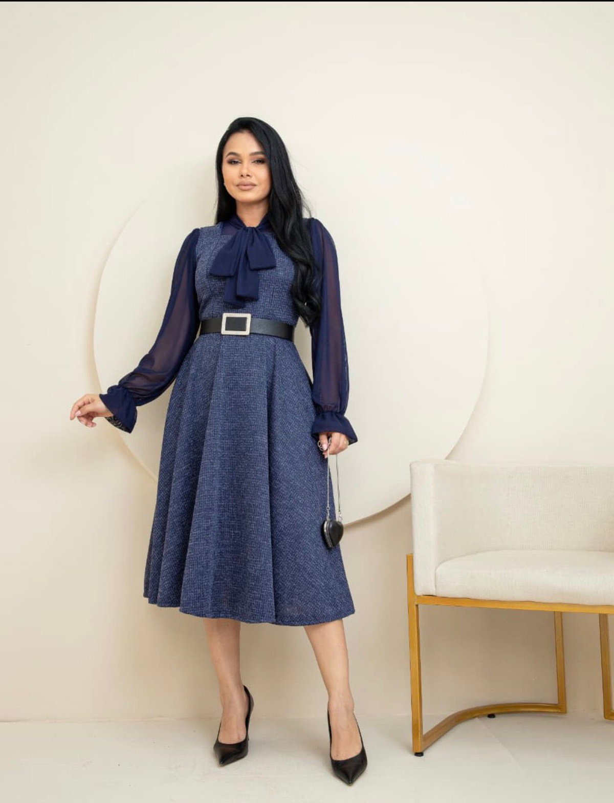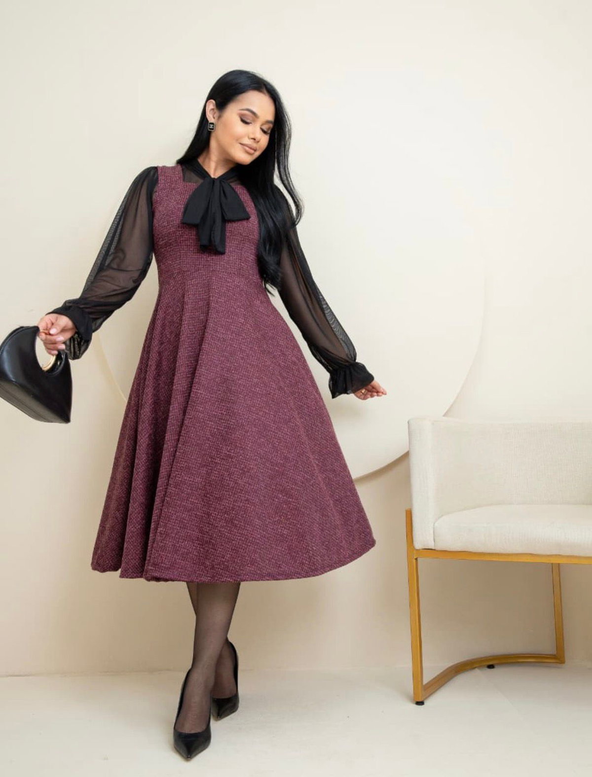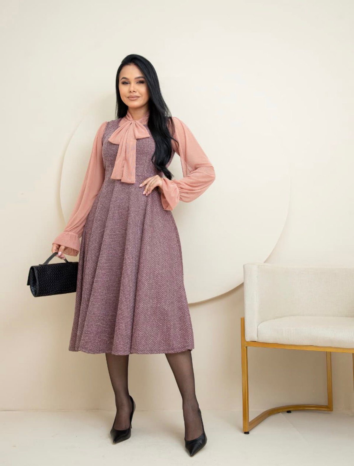 La cintura se destaca con un cinturón que realza la silueta, mientras que la combinación de texturas crea un outfit completo, pensado para ocasiones especiales o para un estilo de oficina elegante.