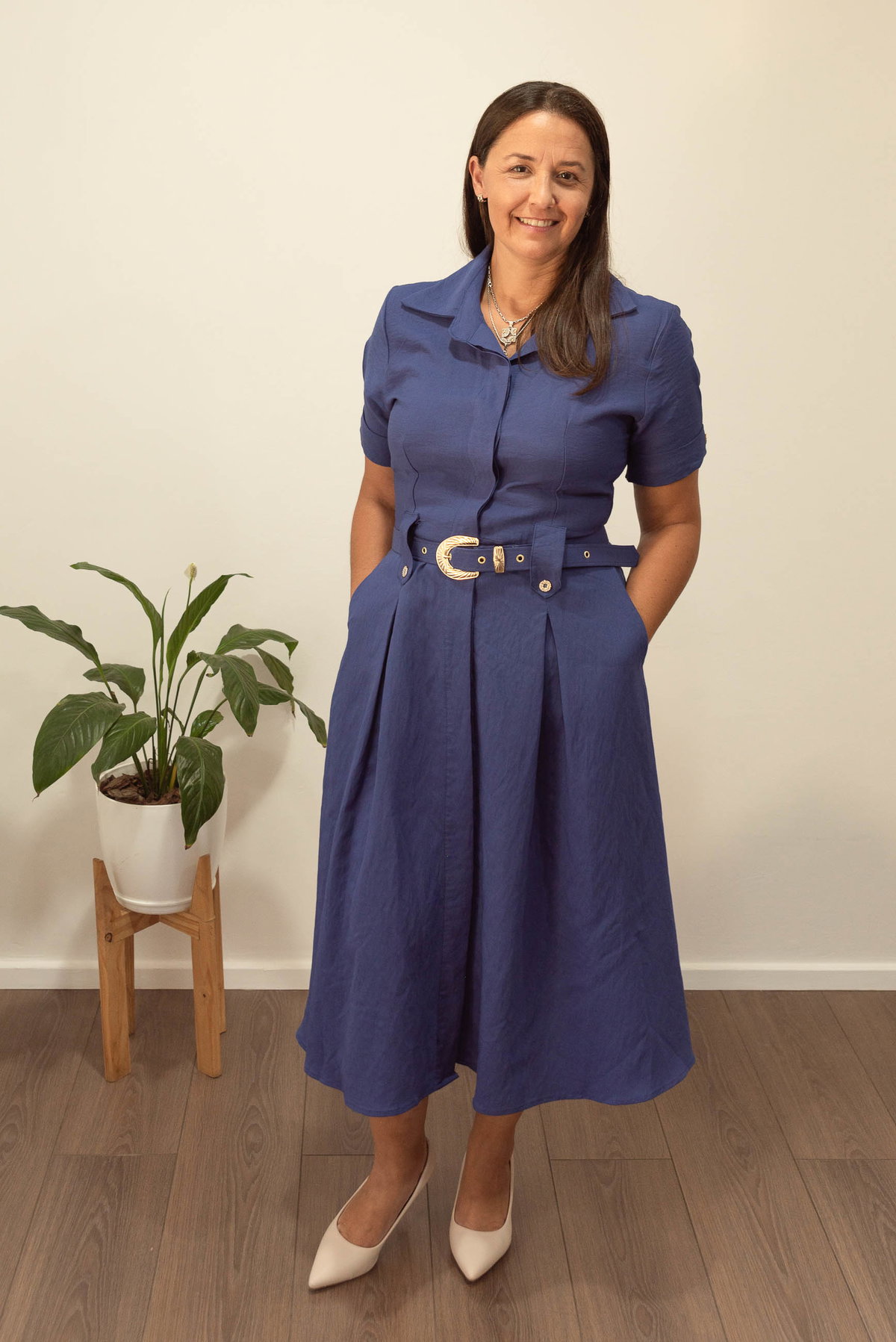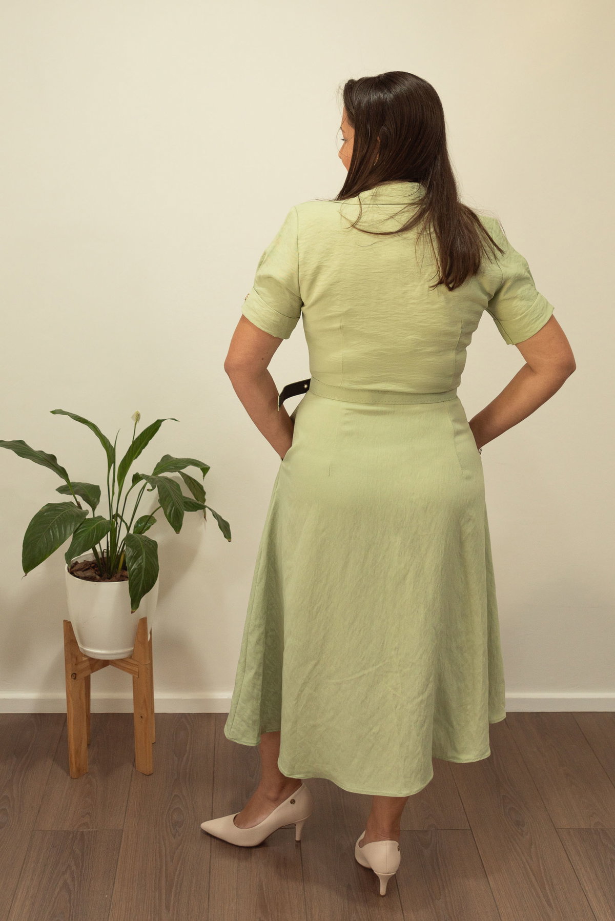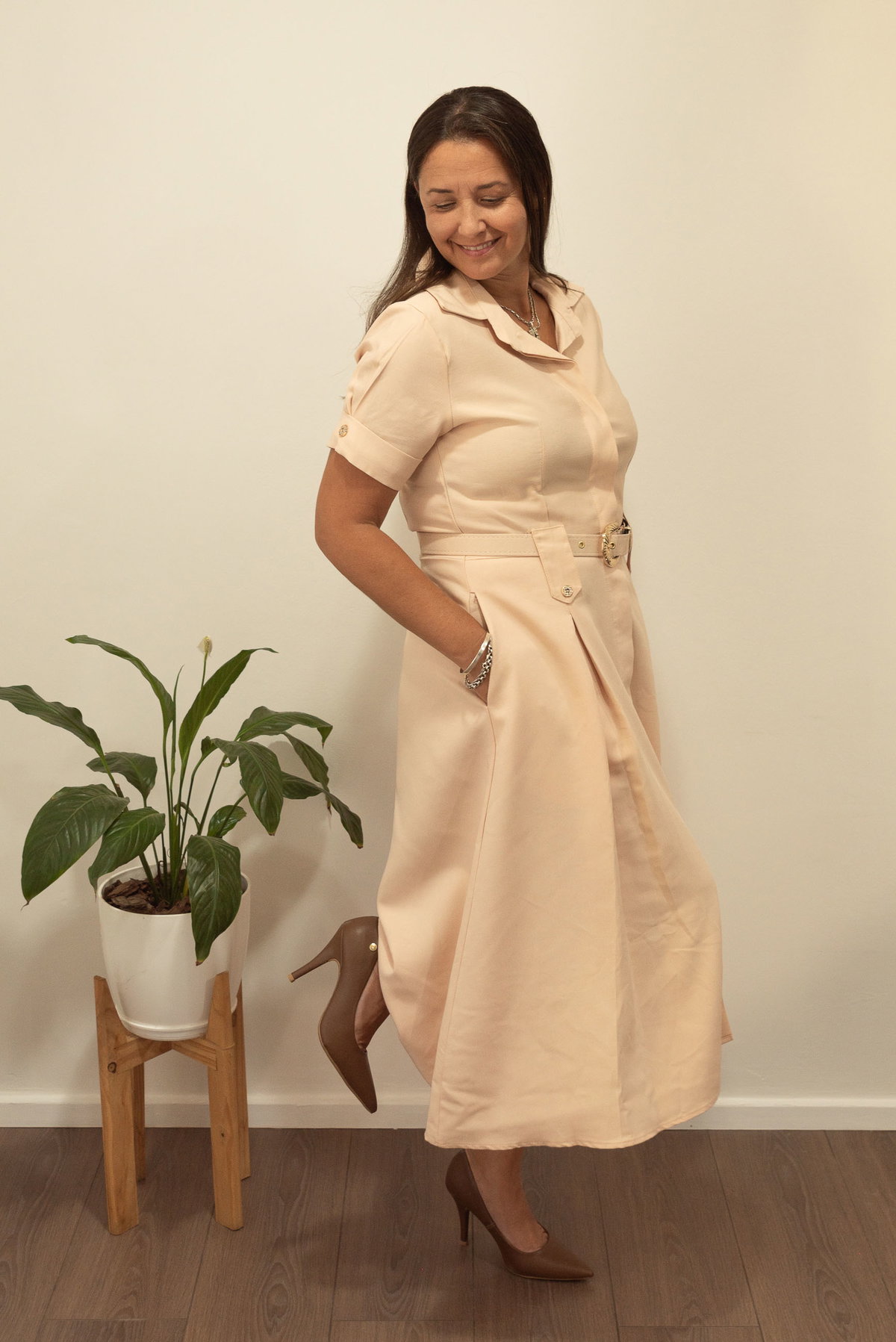 Su diseño incluye botones funcionales cubiertos, cuello camisero clásico y cinto a tono con hebilla que marca delicadamente la cintura. Además, cuenta con bolsillos laterales, un detalle práctico que suma comodidad al diseño.