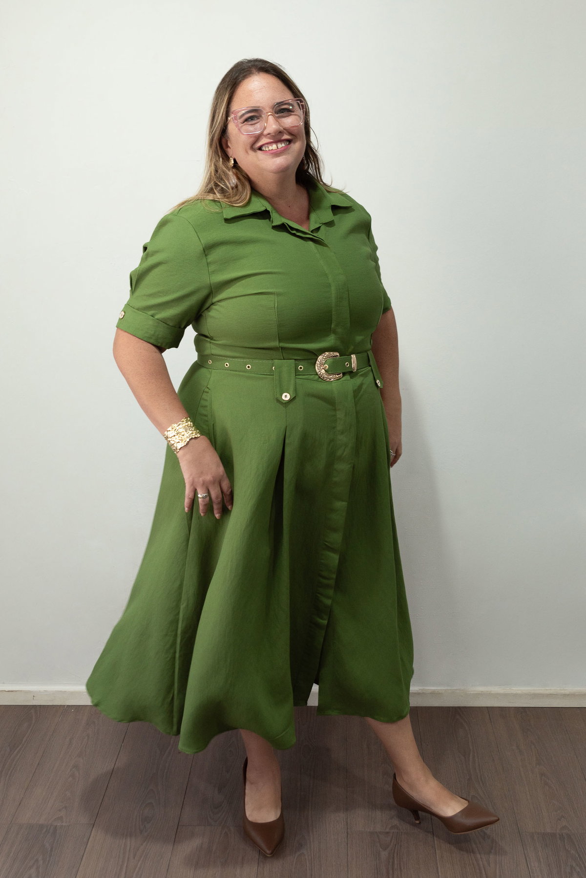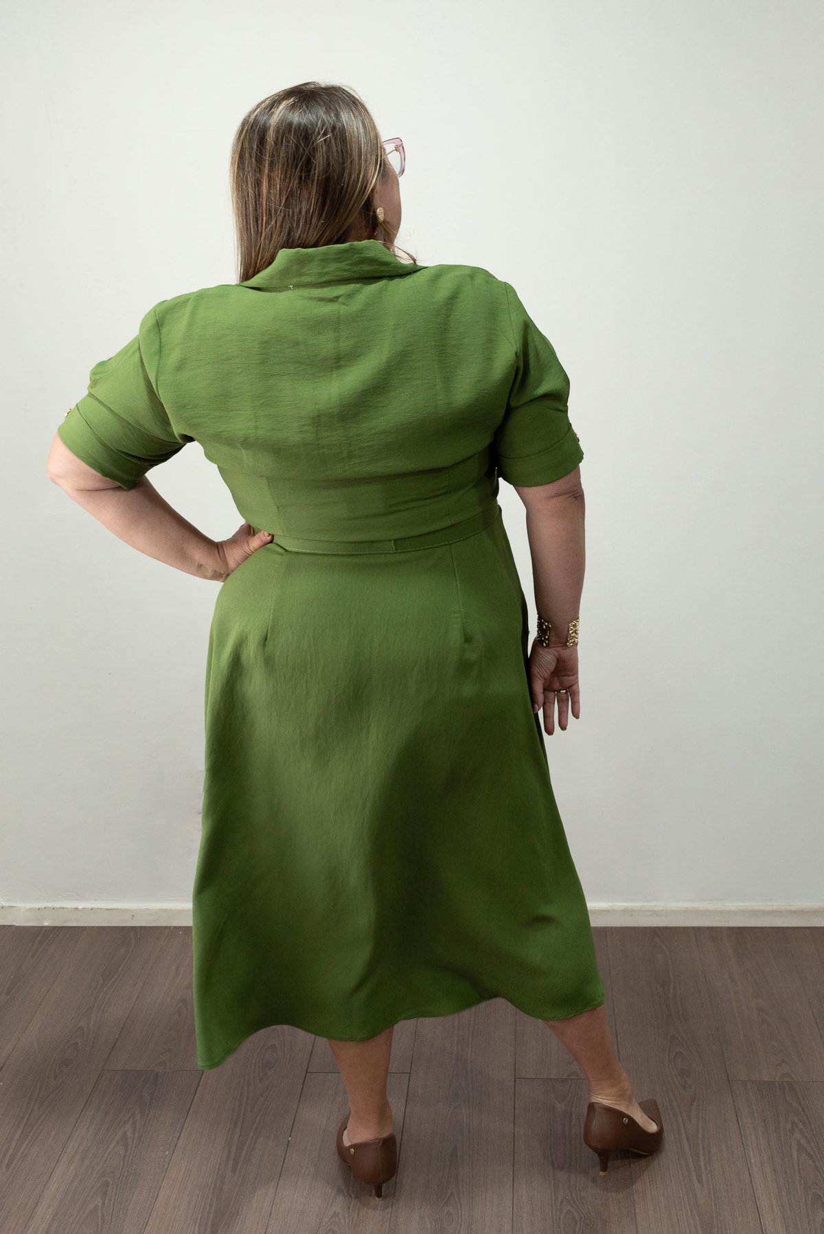 Su diseño incluye botones funcionales cubiertos, cuello camisero clásico y cinto a tono con hebilla que marca delicadamente la cintura. Además, cuenta con bolsillos laterales, un detalle práctico que suma comodidad al diseño.