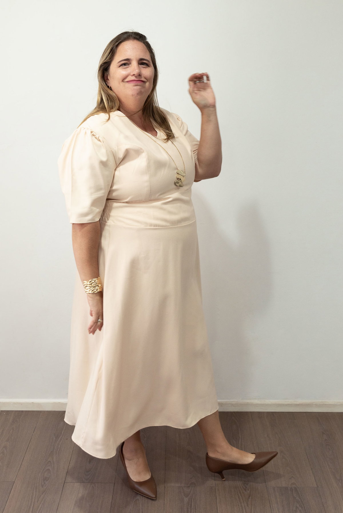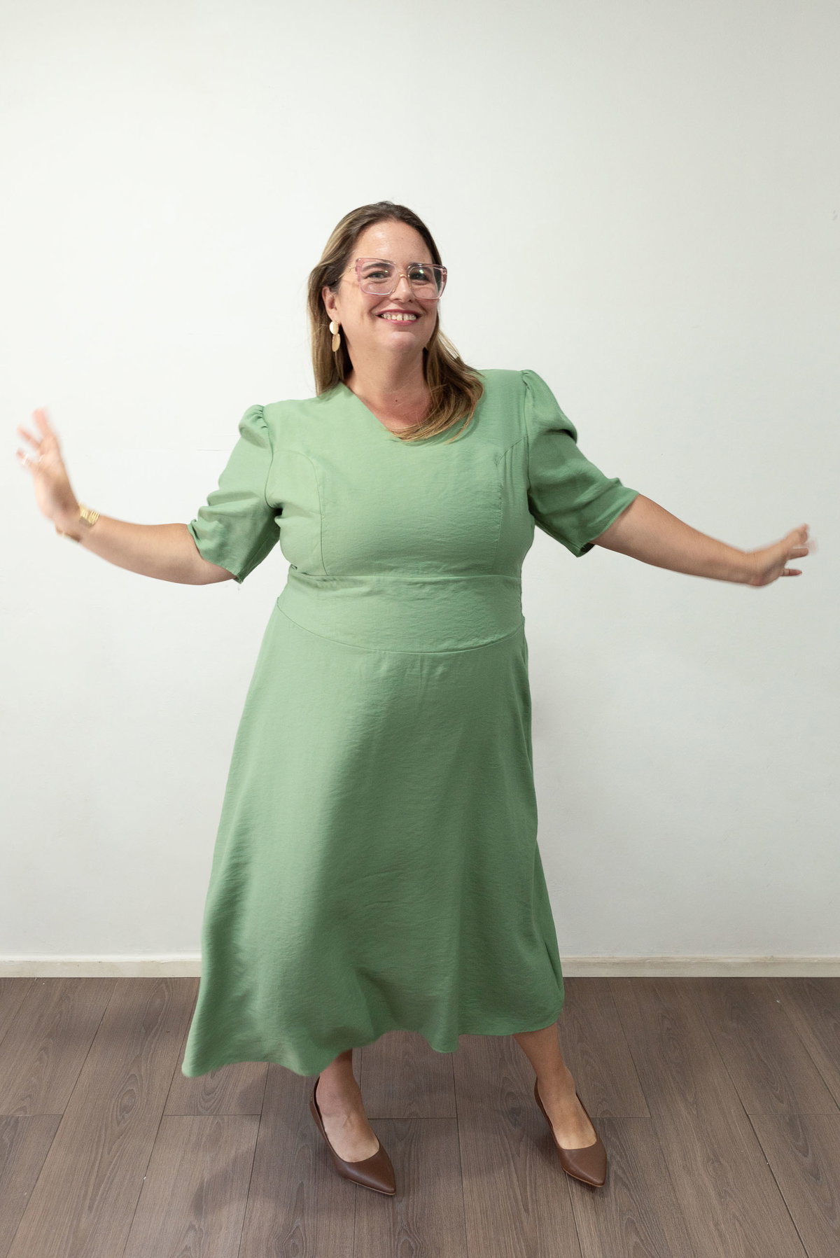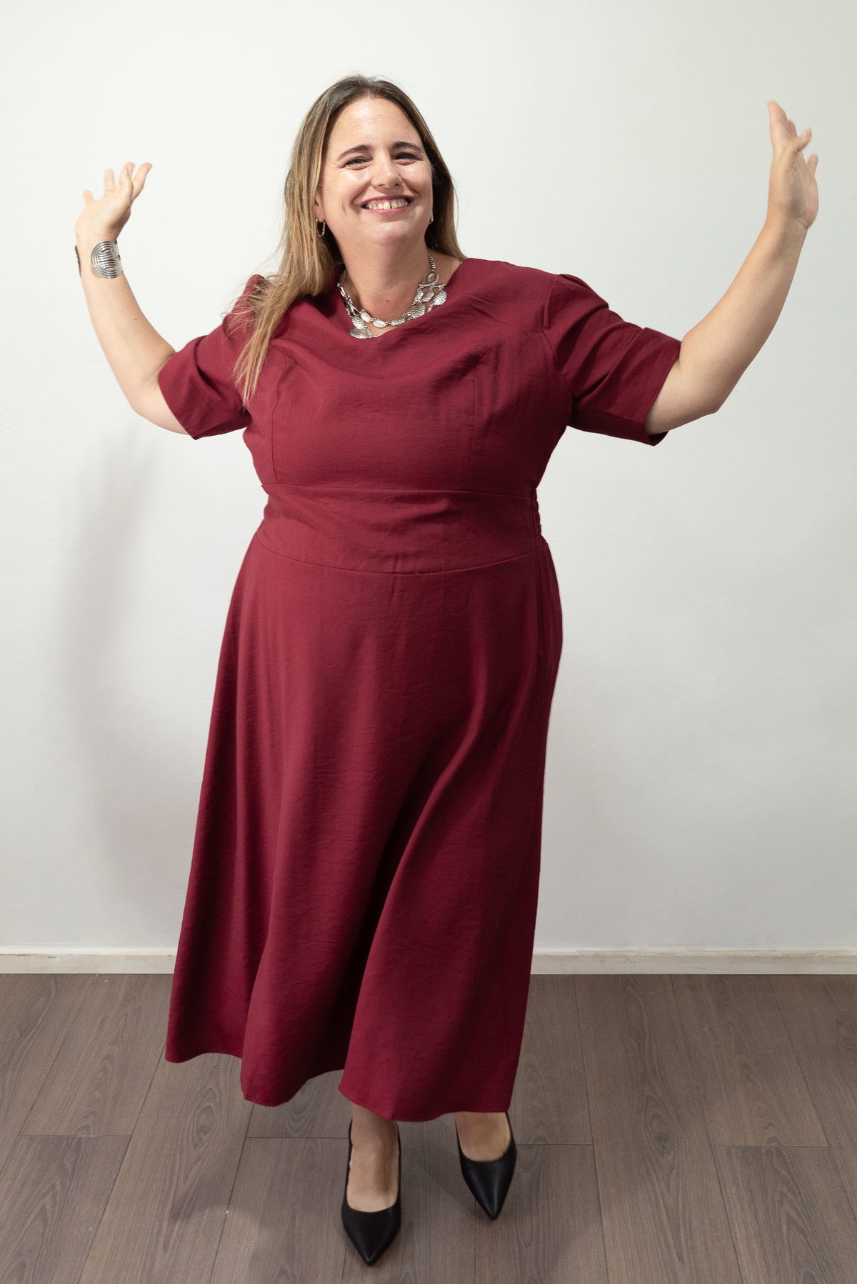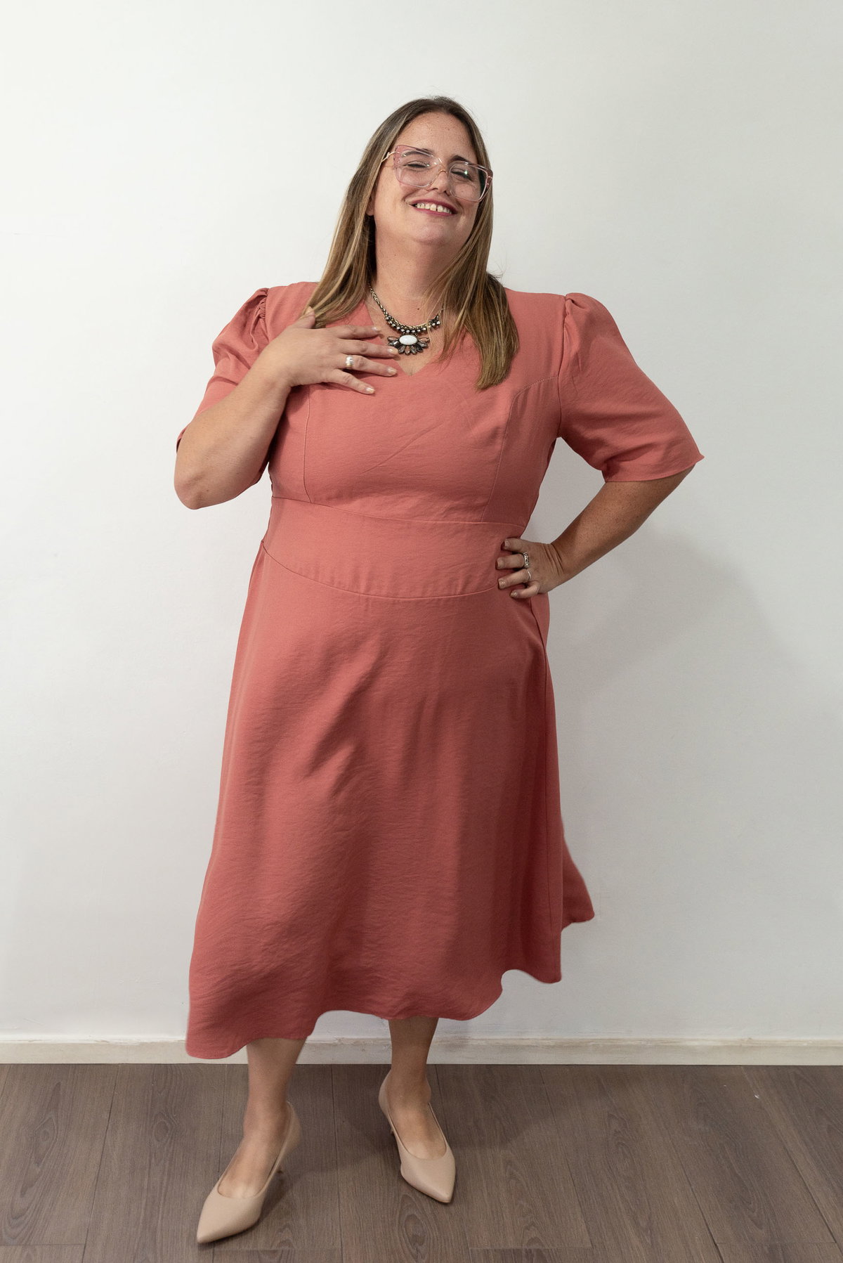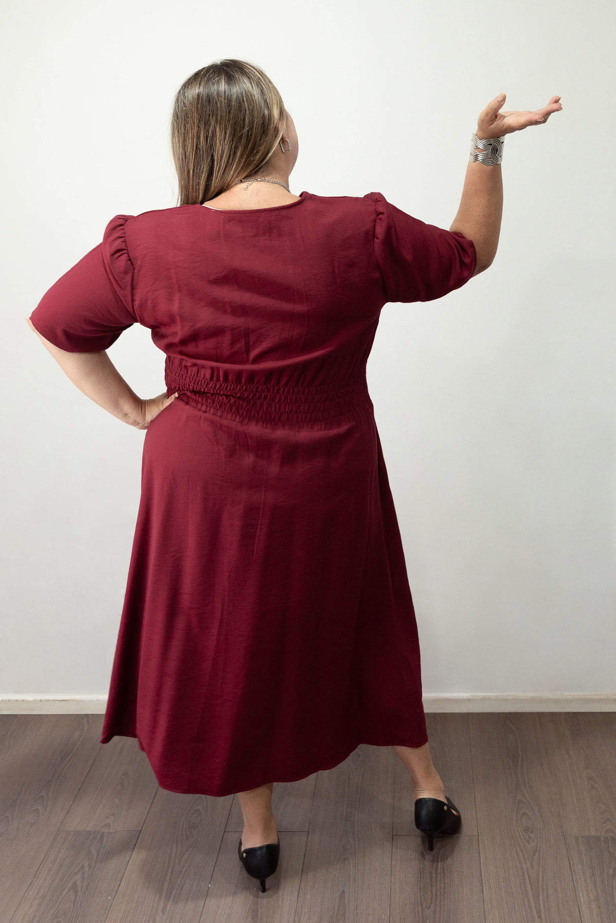 El Vestido Aurora Plus Size está diseñado para realzar la figura con comodidad y elegancia. Su escote en V estiliza el torso y su corte en la cintura con espalda elastizada permite que el vestido se adapte suavemente al cuerpo, brindando un calce cómodo y favorecedor.