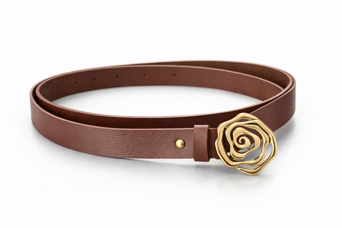 El cinto Allegra es ese detalle que transforma cualquier look. Confeccionado en material símil cuero en tono marrón cálido, se destaca por su hebilla dorada con diseño floral en relieve, protagonista absoluta de la pieza.