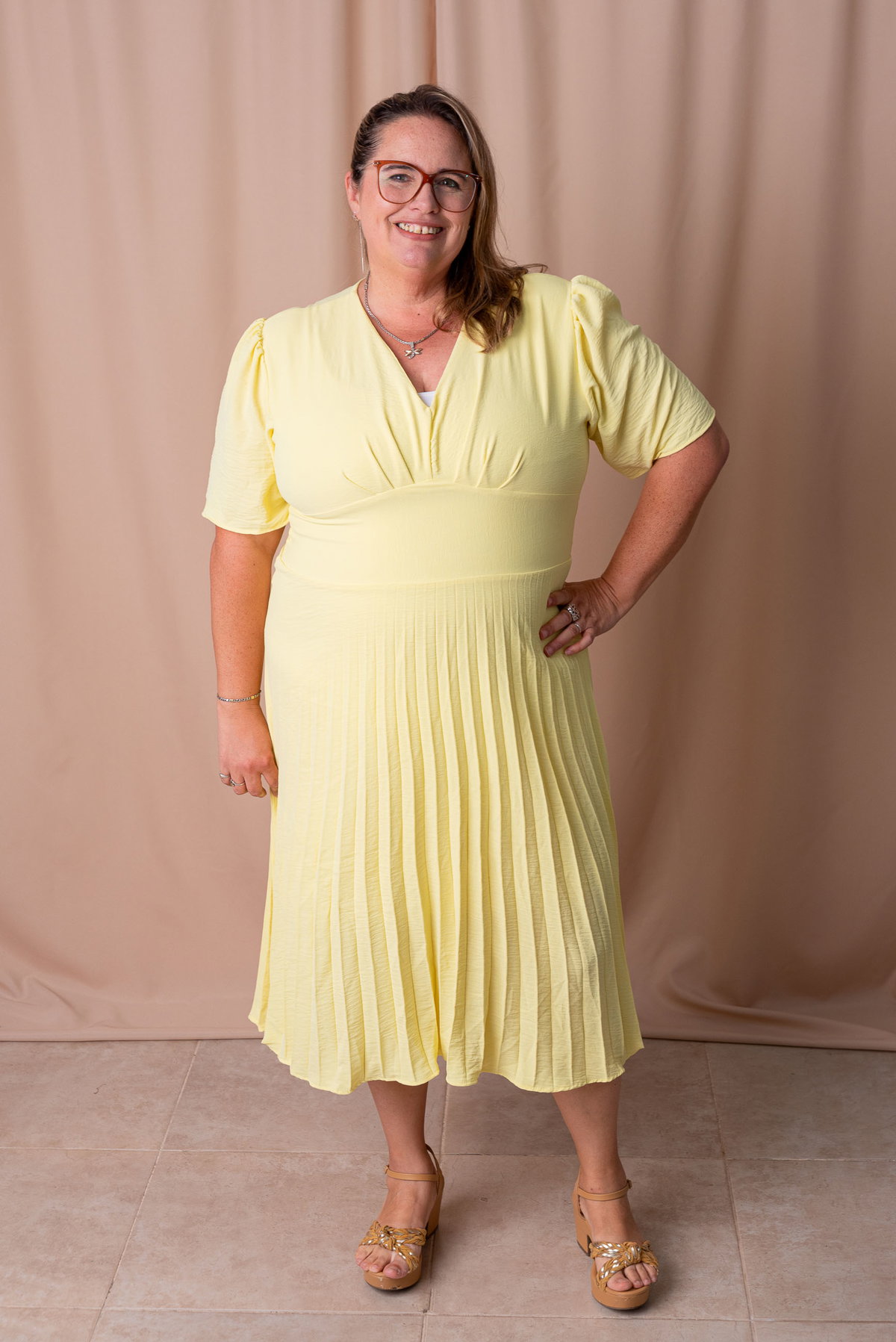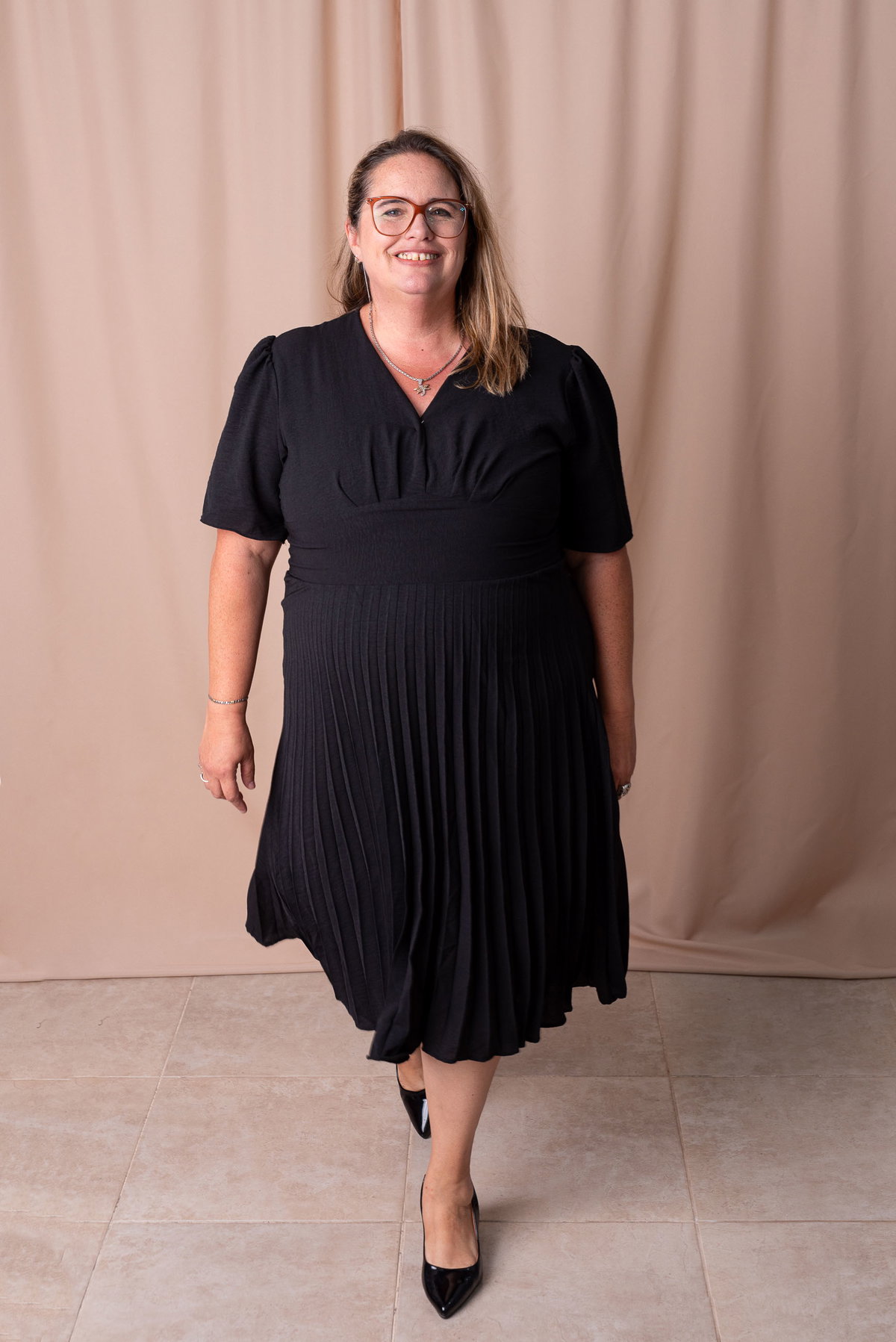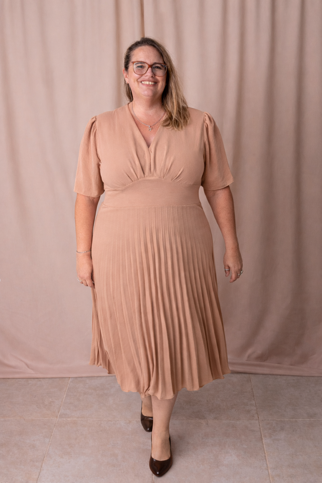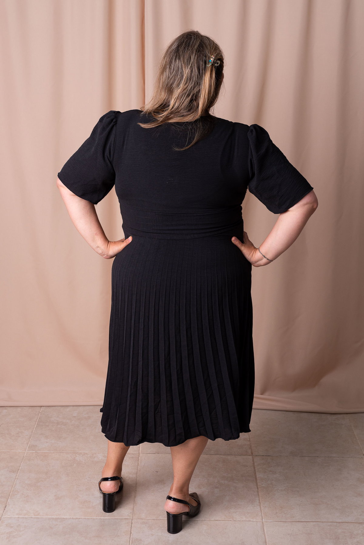 El vestido Adette es la combinación perfecta de elegancia y comodidad. Diseñado especialmente para talles plus size, cuenta con un corte favorecedor en la cintura que realza la silueta sin ajustar. Su escote en V estiliza el torso y las mangas cortas aportan un calce cómodo y femenino.