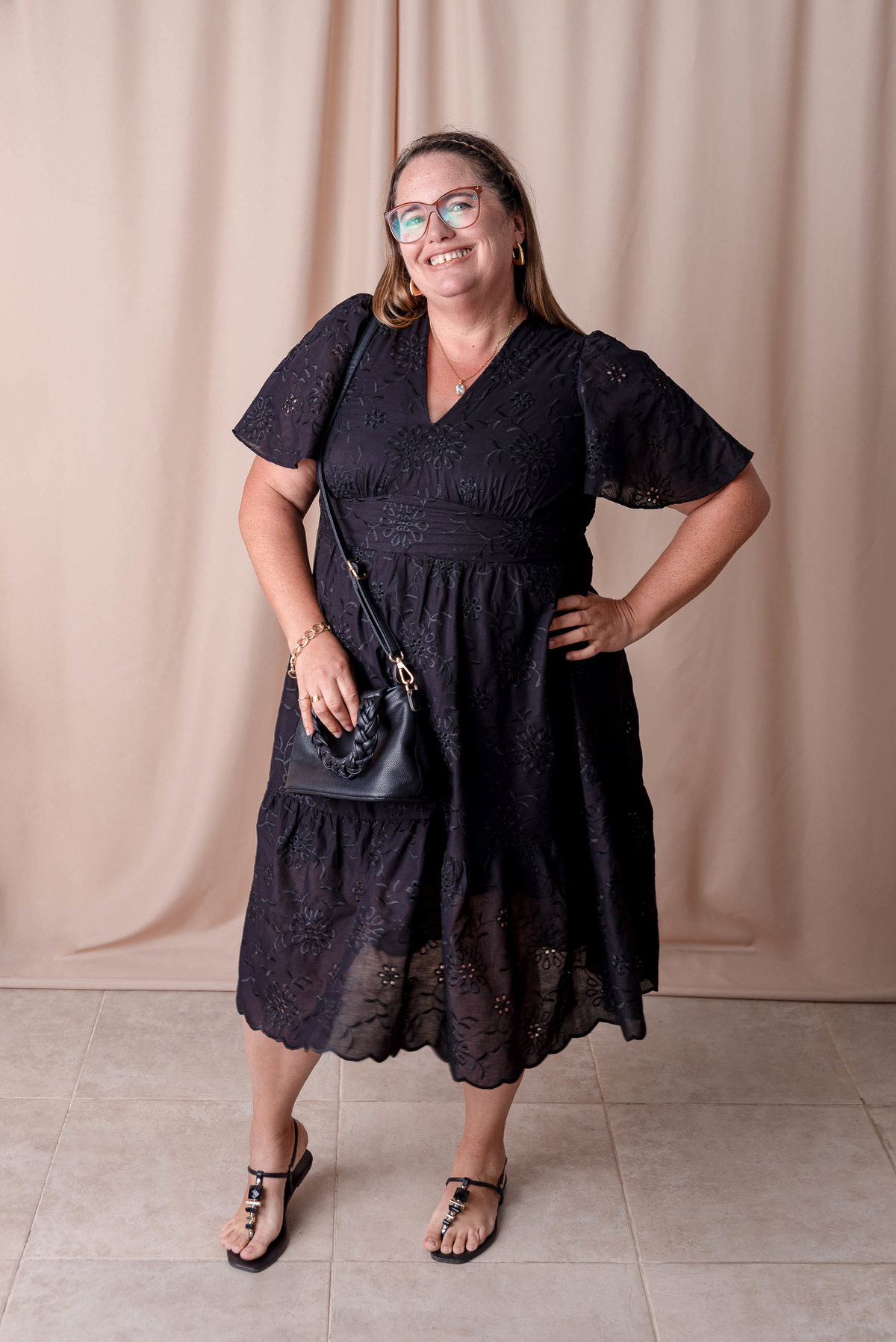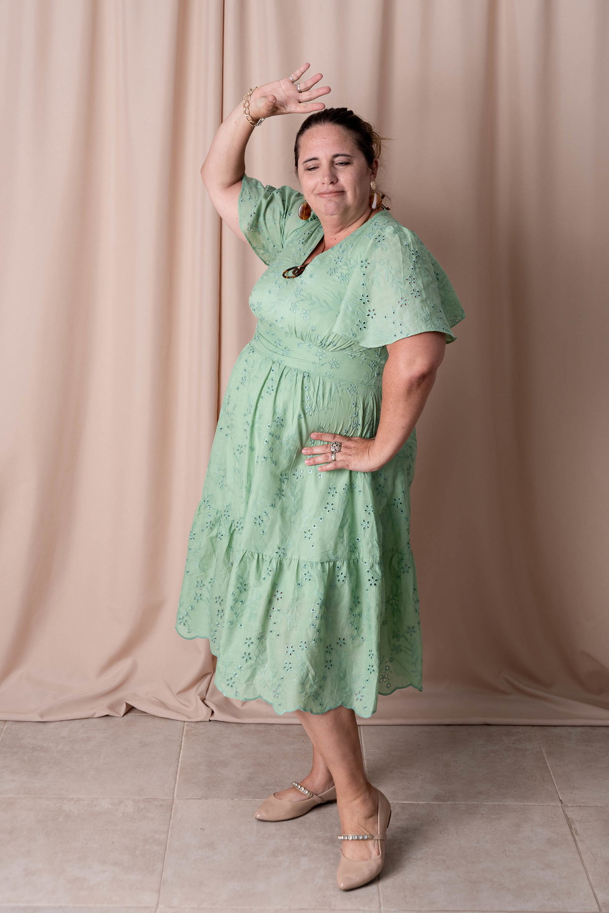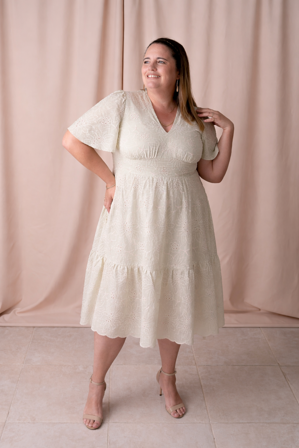 El vestido Adaire es una opción delicada y femenina, pensado especialmente para talles plus size. Confeccionado en broderie, se destaca por su textura y detalles bordados que aportan un estilo romántico y elegante.