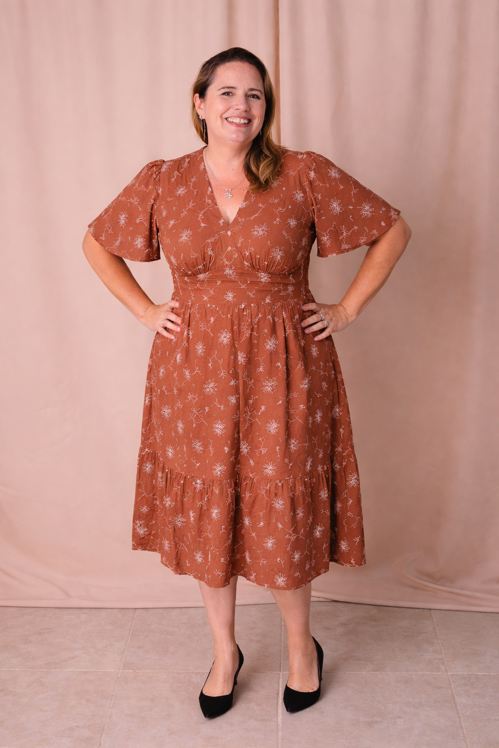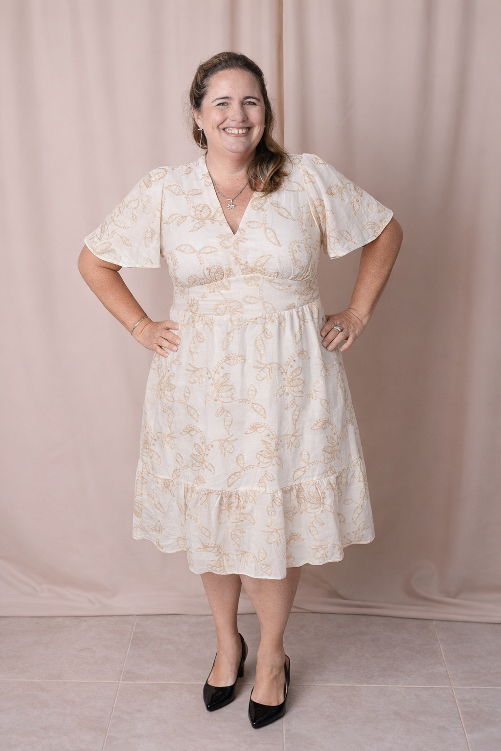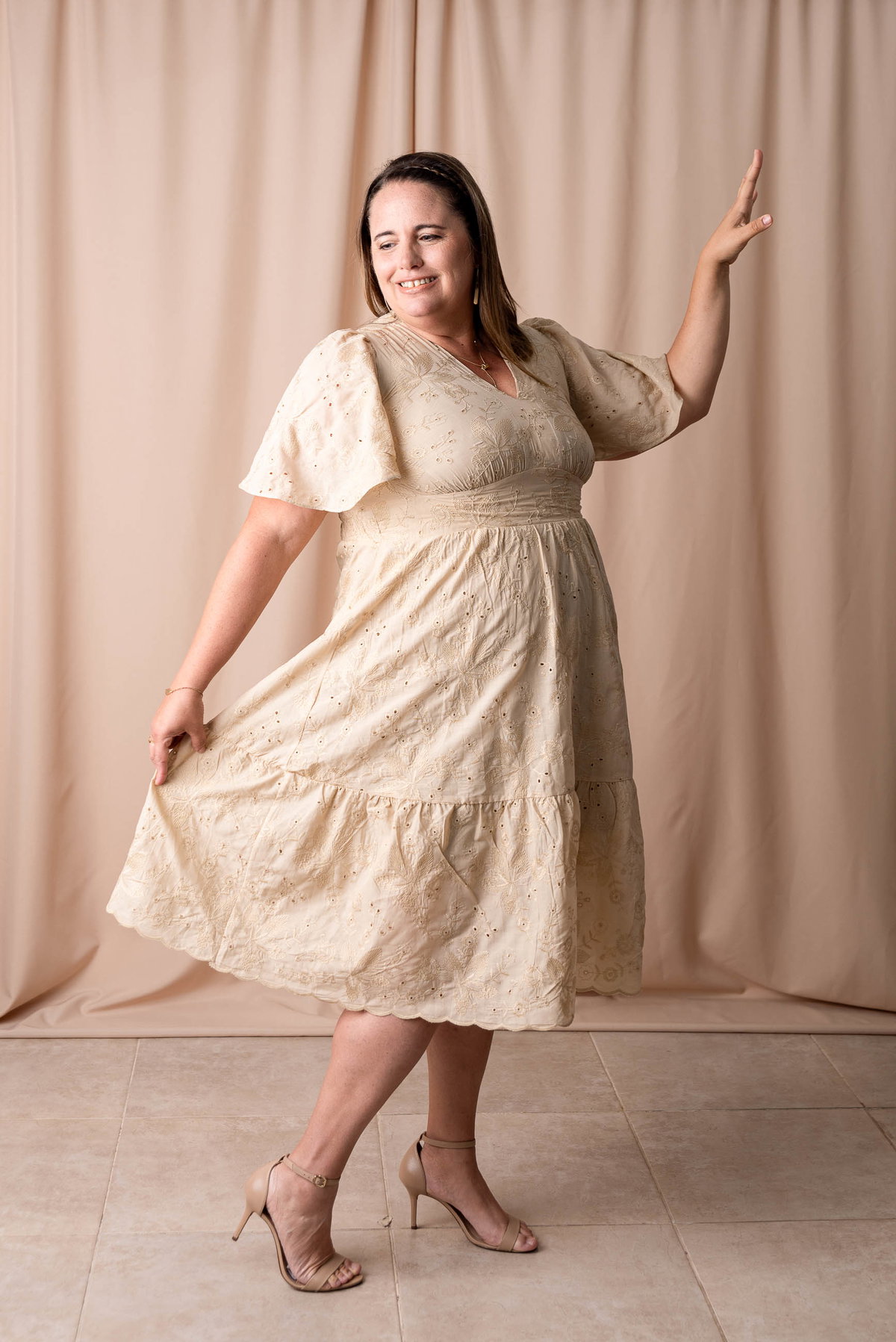 El vestido Adaire es una opción delicada y femenina, pensado especialmente para talles plus size. Confeccionado en broderie, se destaca por su textura y detalles bordados que aportan un estilo romántico y elegante.