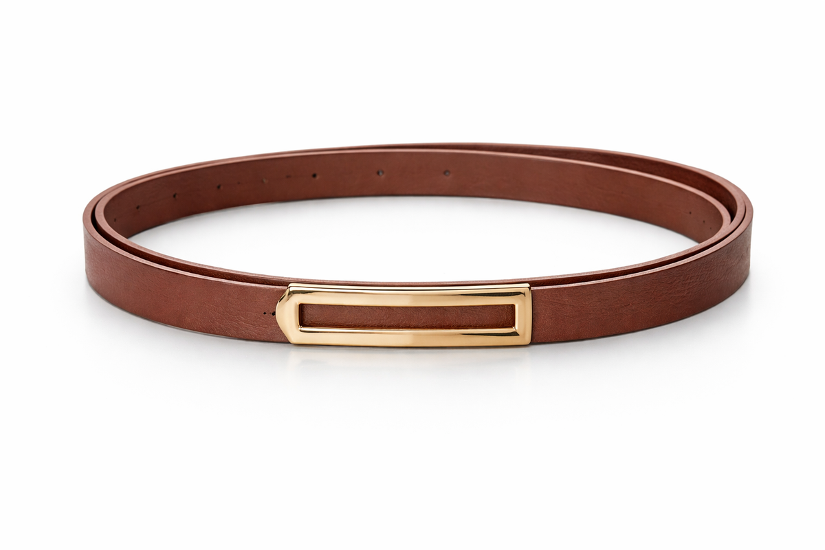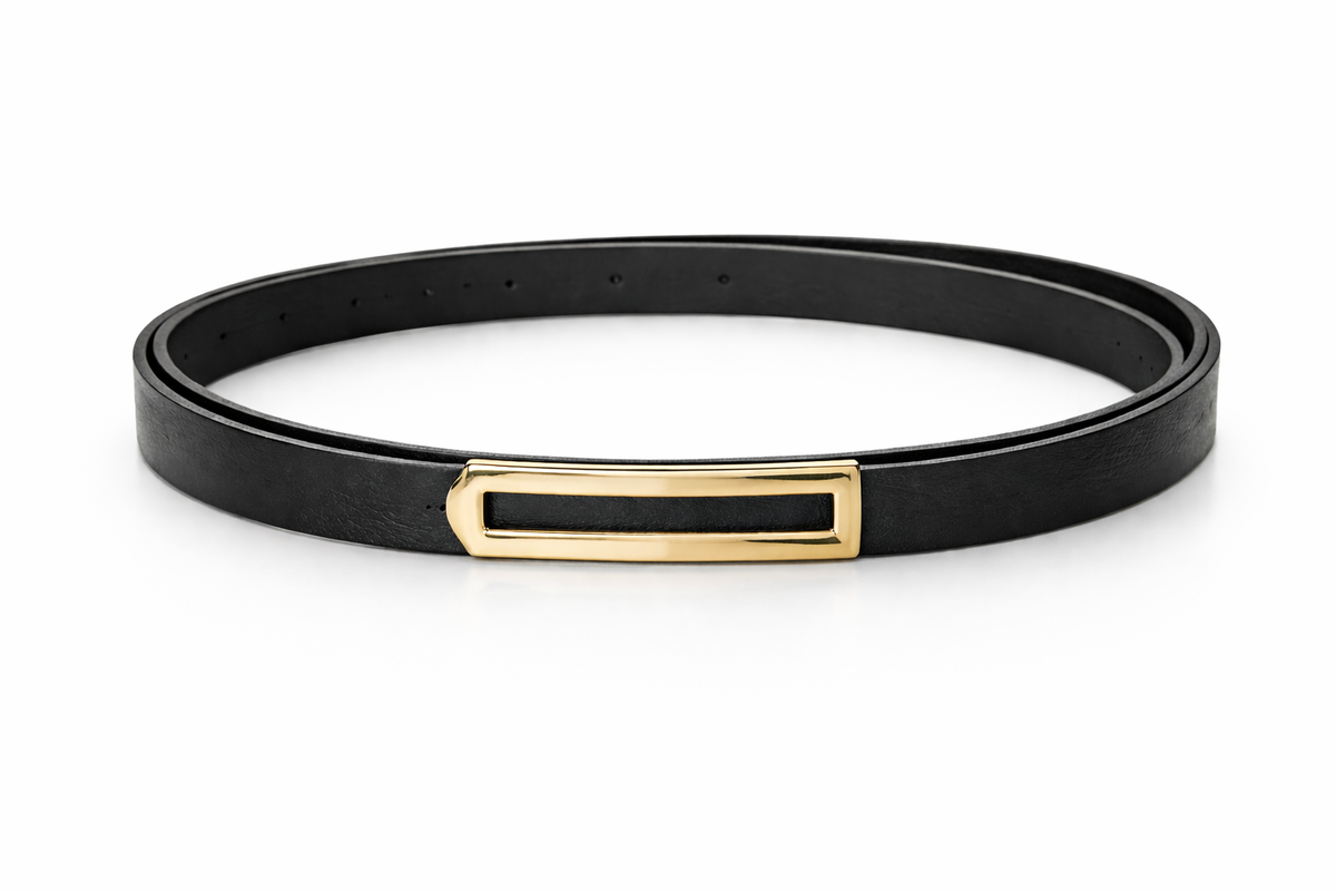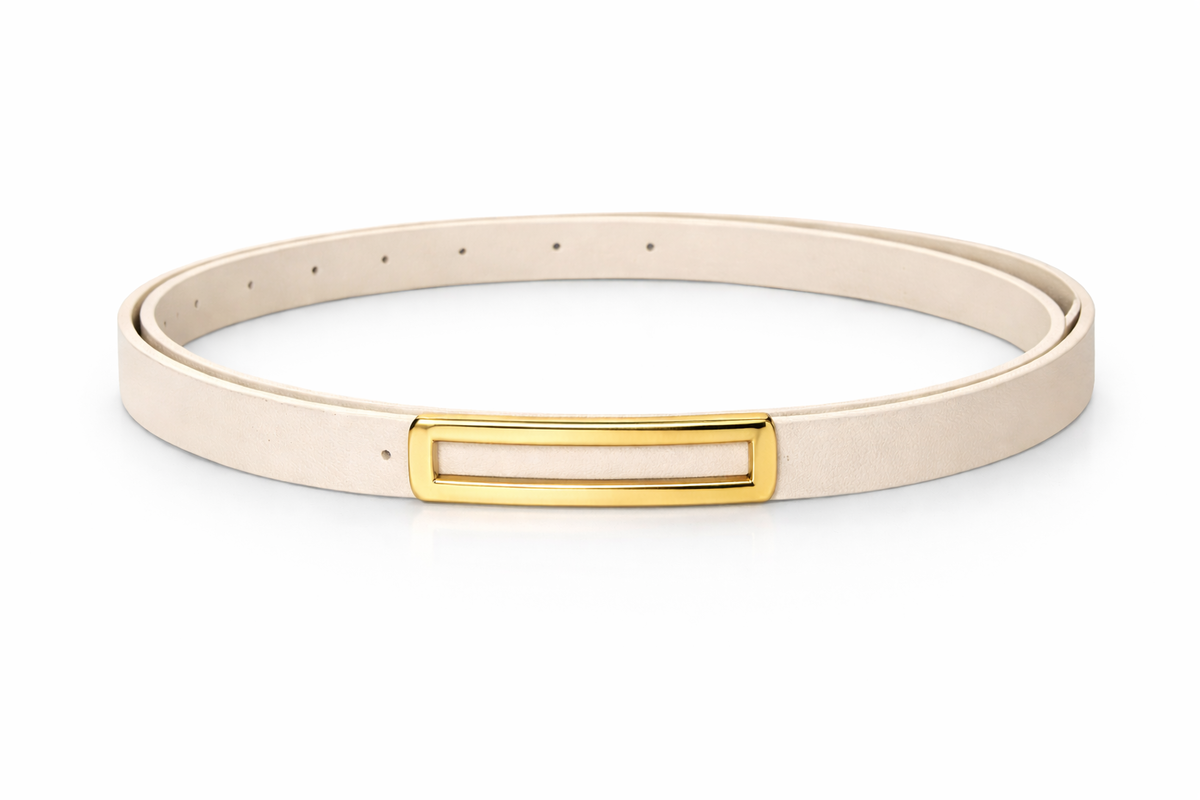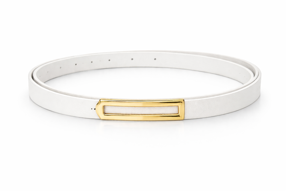 Cinto fino de diseño minimalista con hebilla rectangular dorada que aporta un toque elegante y moderno. Ideal para marcar la cintura en vestidos, blazers o pantalones de tiro alto.