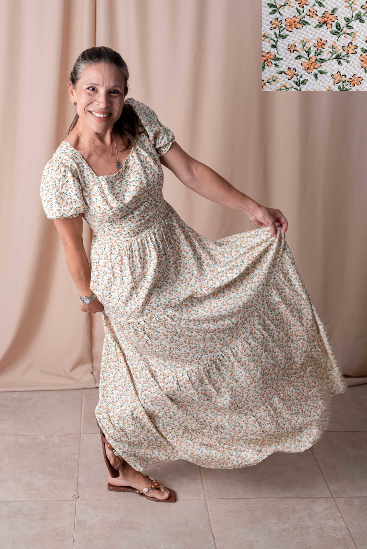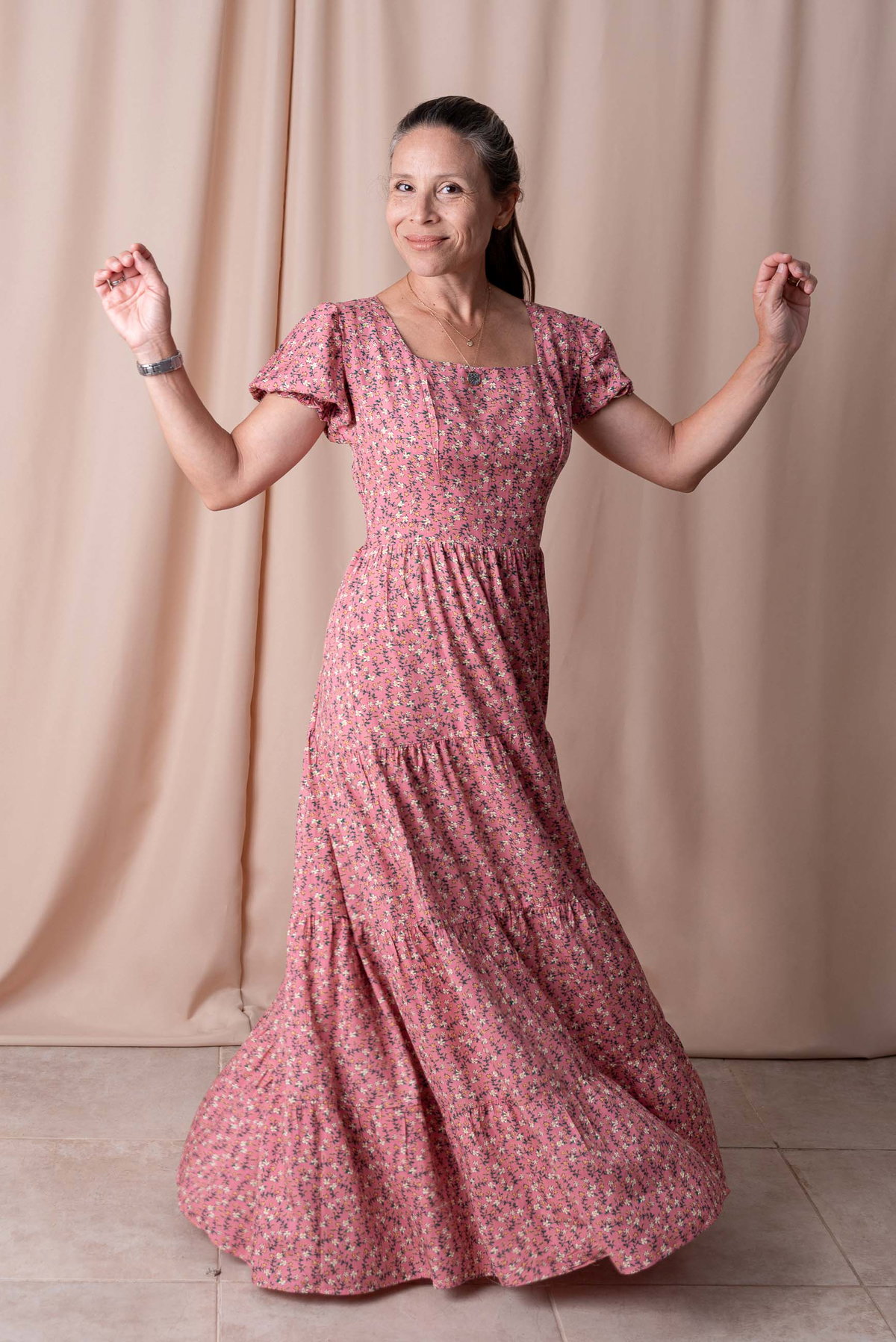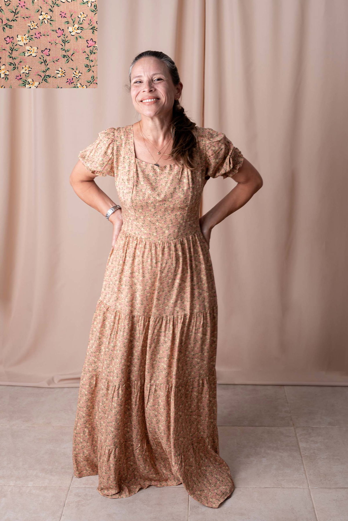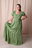 Su escote cuadrado realza el rostro y aporta un toque clásico, mientras que las mangas bombé con puño elastizado suman volumen y un aire romántico. La falda larga con volados ofrece movimiento y fluidez, perfecta para caminar, bailar o lucir en cualquier ocasión.