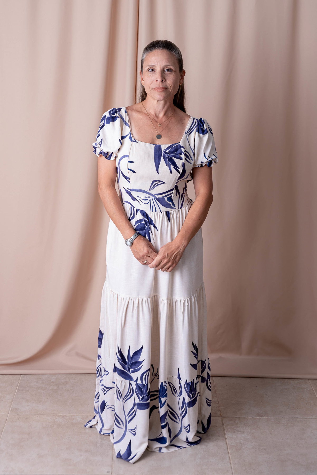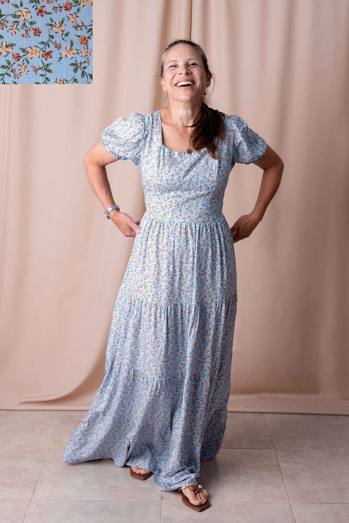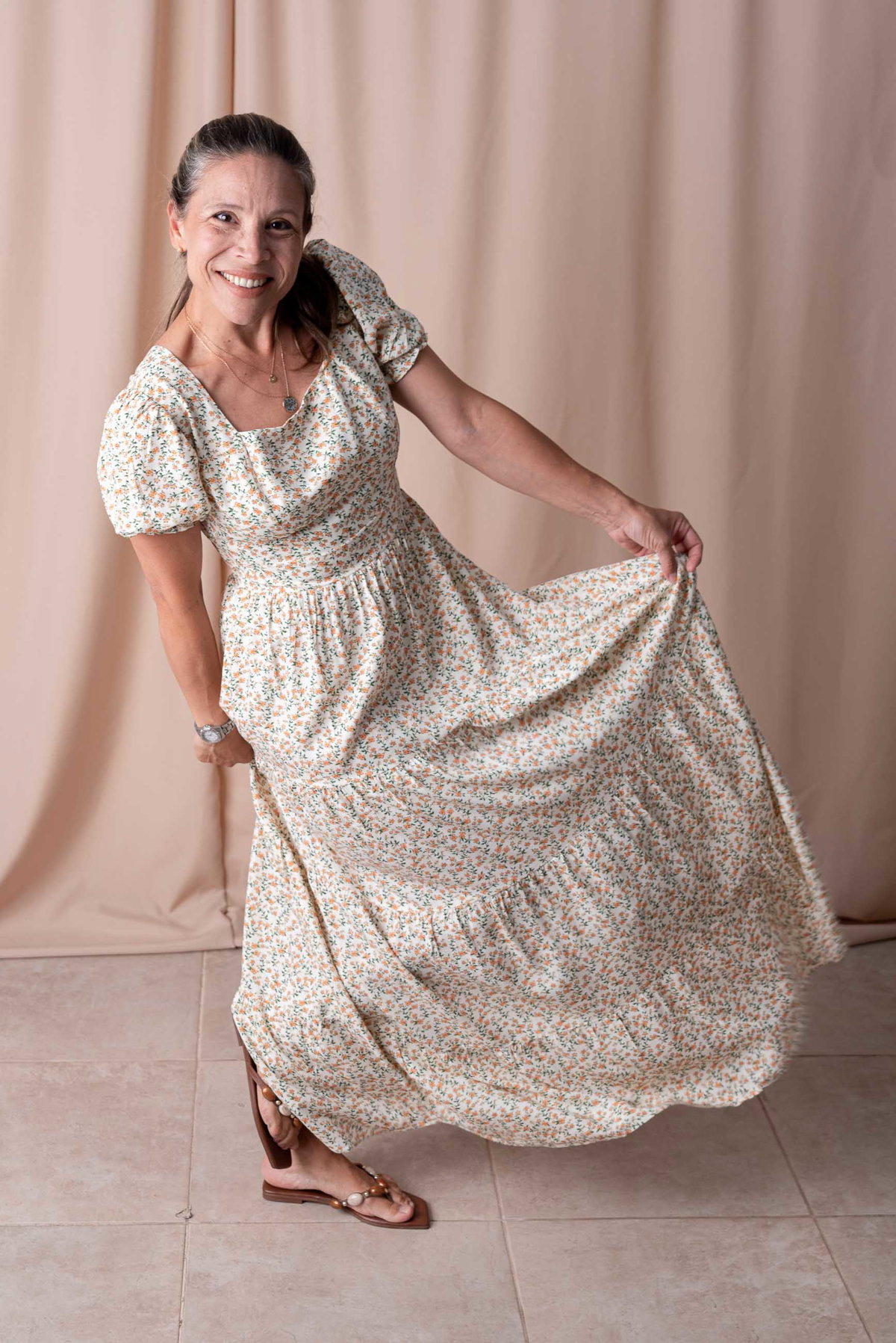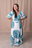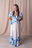 Su escote cuadrado realza el rostro y aporta un toque clásico, mientras que las mangas bombé con puño elastizado suman volumen y un aire romántico. La falda larga con volados ofrece movimiento y fluidez, perfecta para caminar, bailar o lucir en cualquier ocasión.