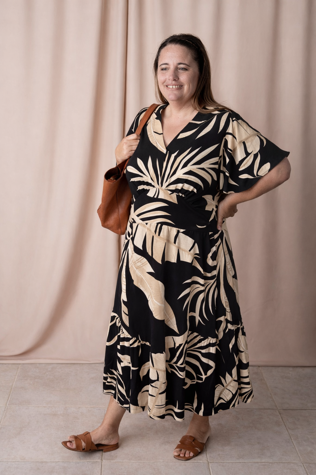 Su diseño con escote en V, cintura marcada y falda con caída suave realza la silueta sin ajustar, pensado especialmente para talles plus size 🤍