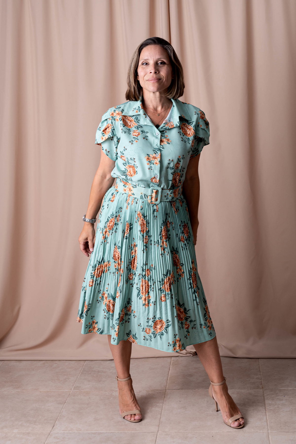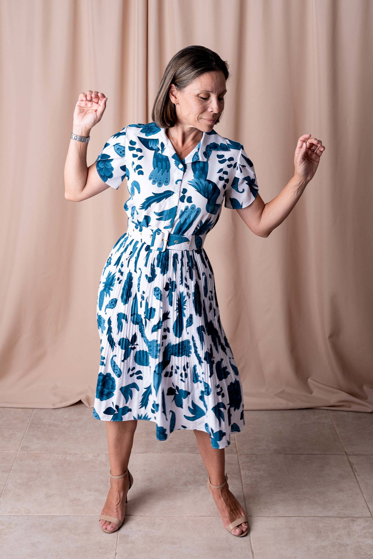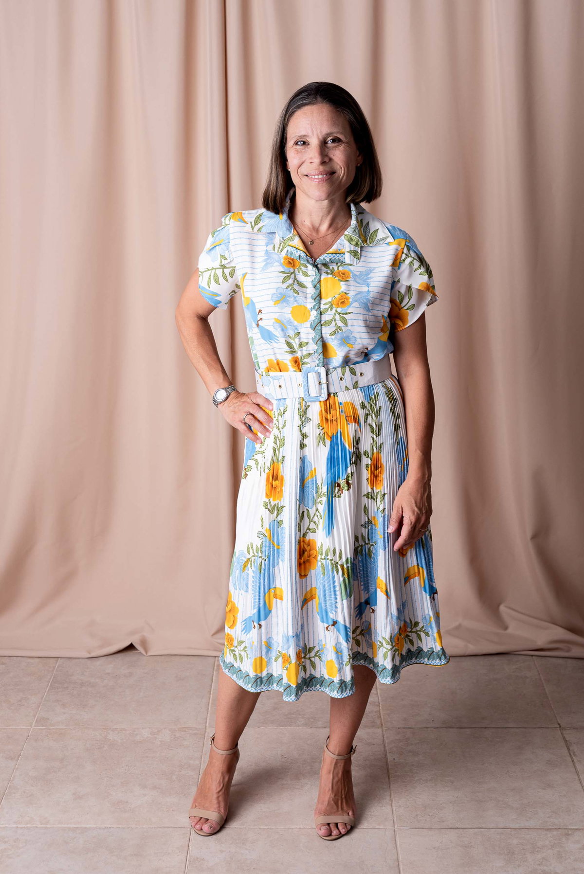 El vestido Adena es fresco, delicado y lleno de encanto. Su diseño combina una parte superior estilo camisero, que aporta prolijidad y versatilidad, con una falda plisada que suma movimiento y un aire romántico al caminar.