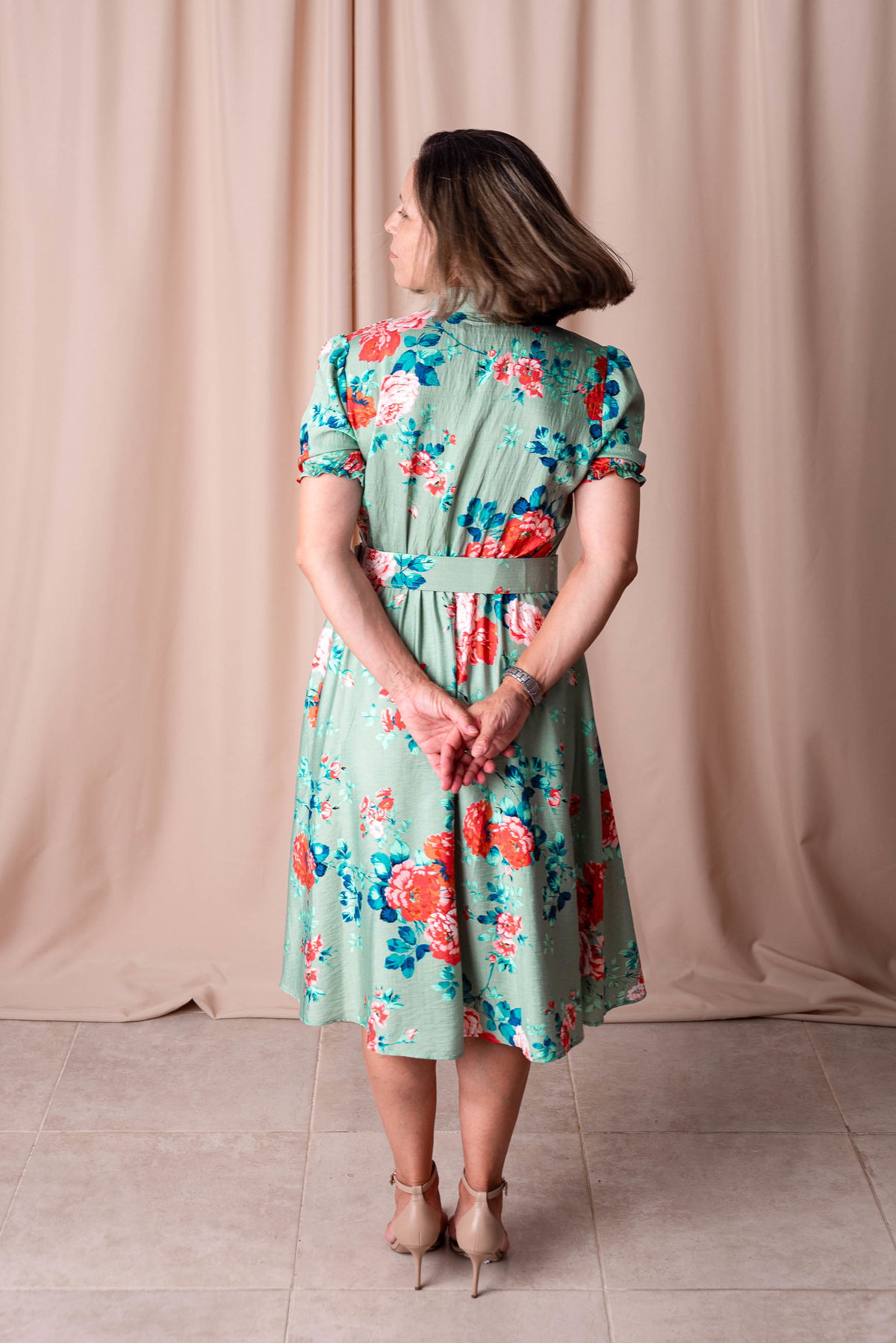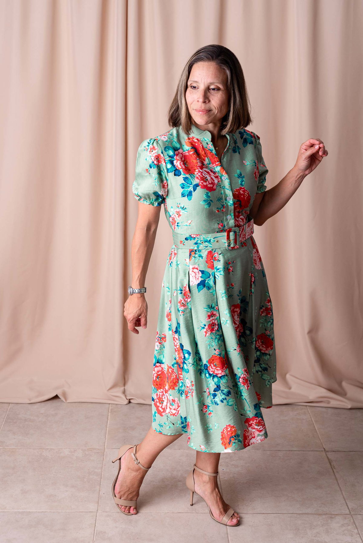 Tiene parte superior camisera, mangas cortas levemente abullonadas y un corte que realza la figura, acompañado por un cinto a tono que marca la cintura de forma delicada. La falda con buena amplitud y caída natural brinda comodidad y movimiento, perfecta para el uso diario o encuentros especiales.