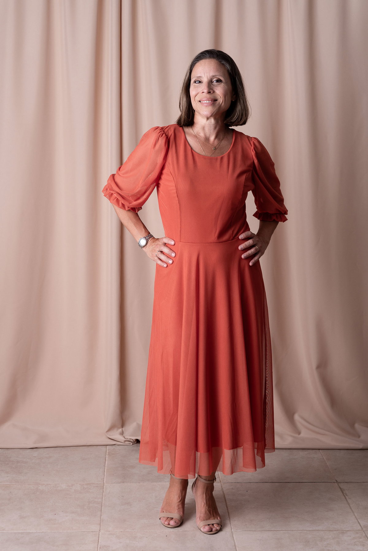 En este hermoso color terracota, Alfa es perfecto para eventos, celebraciones o para lucirte con un estilo único.
