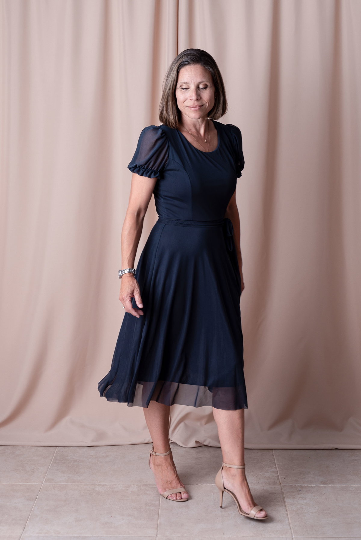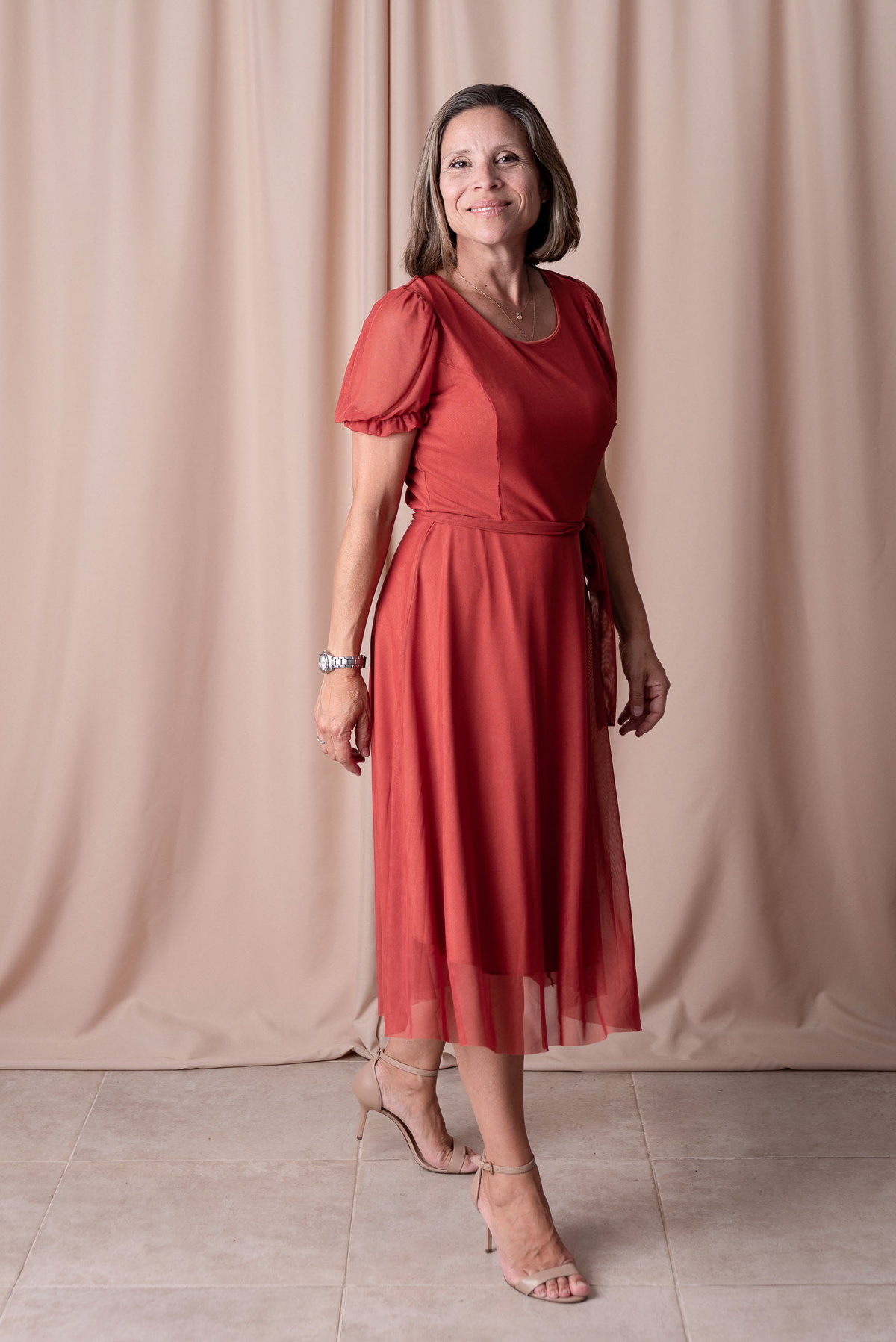 Su diseño incluye mangas cortas traslúcidas con frunce, que aportan un toque romántico, y una falda amplia que acompaña cada paso con gracia. Ideal para eventos, cenas, celebraciones o simplemente para sentirte especial.